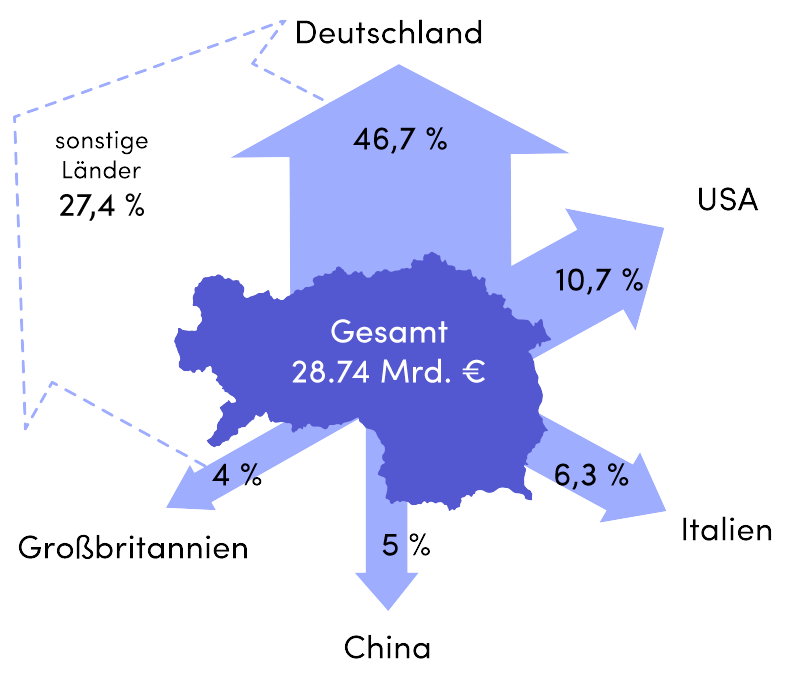 3 von 4 der vor Ort erzeugten Produkte werden exportiert (in andere Länder verkauft und geliefert) – manche davon fliegen mit Weltraummissionen sogar zum Mars. Die Hauptexportmärkte der Steiermark sind die EU-Länder, die USA und Asien. Genauer gesagt gehen die Exporte nach …